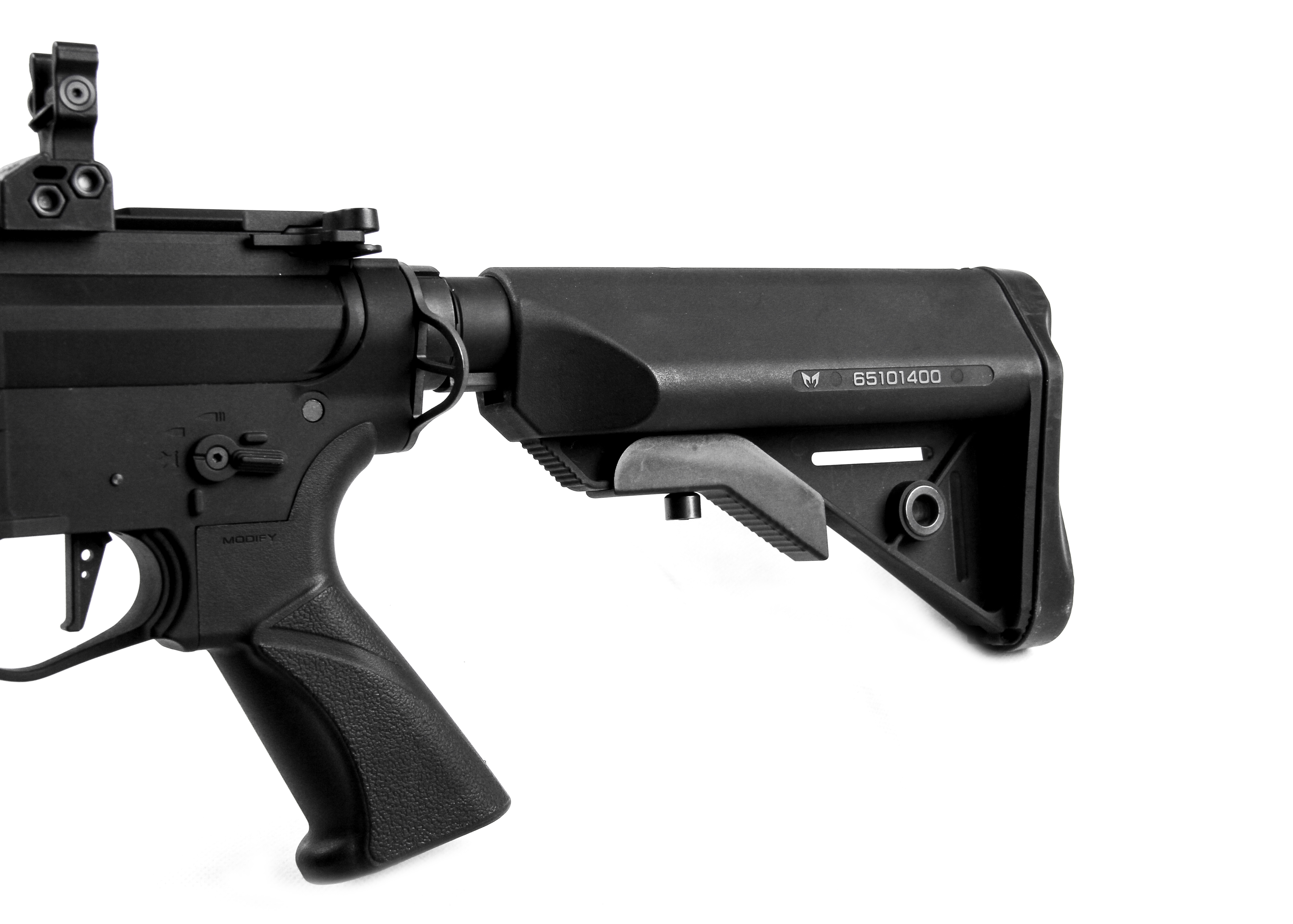 人體工學設計的6段可調海豹式後托及握把。